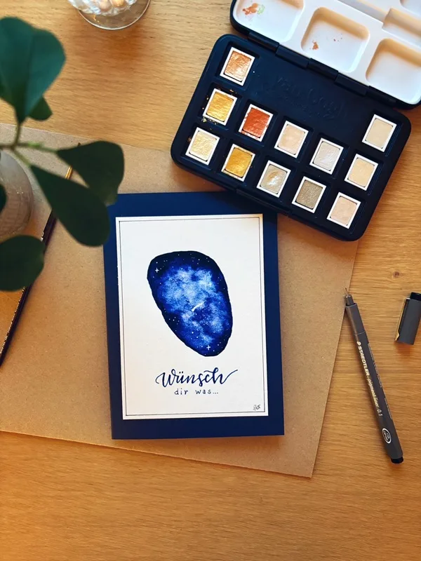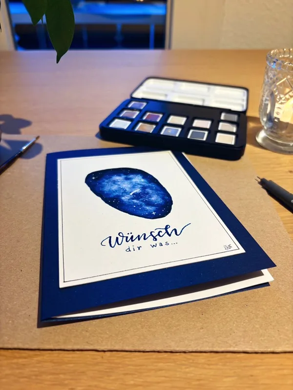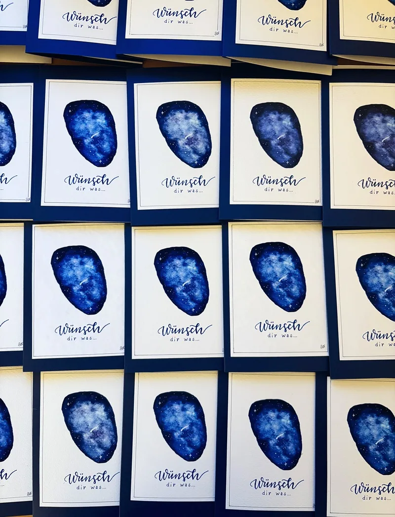 Aus unseren Gesprächen heraus entwickelte sich Schritt für Schritt die Idee eines Sternenhimmels. Ein Motiv, das Weite schafft und zum Innehalten einlädt. Funkelnde Sterne, eine leuchtende Sternschnuppe in der Mitte und darunter im feinen Handlettering die Worte „Wünsch dir was…“ – eine stille Einladung zum Träumen, Reflektieren und Wünschen.