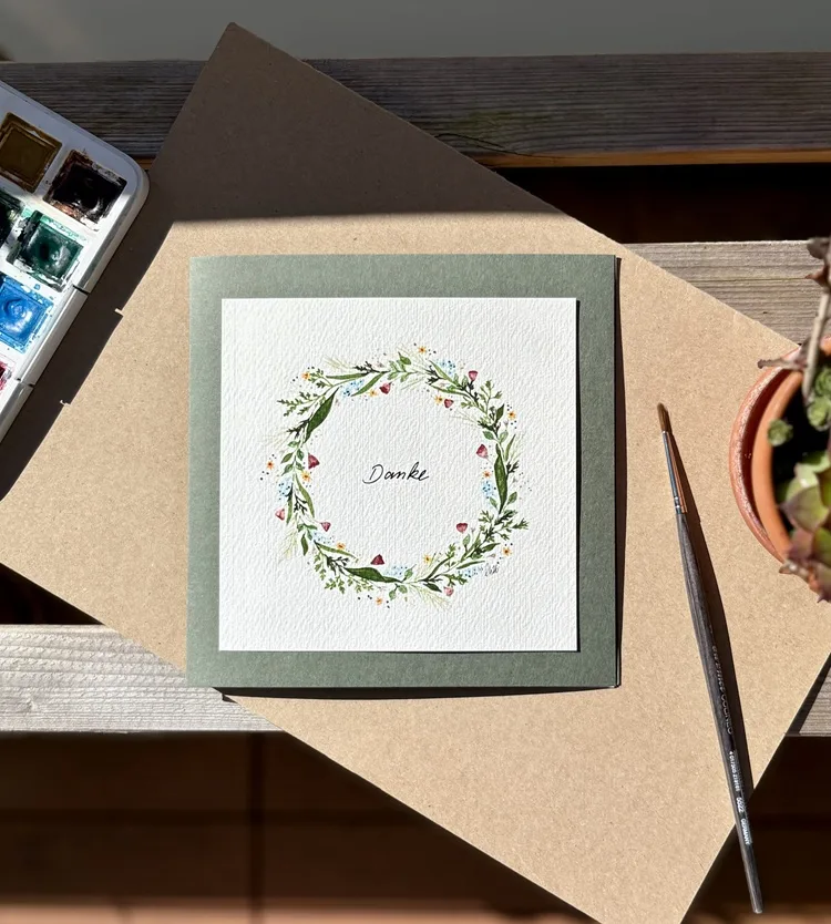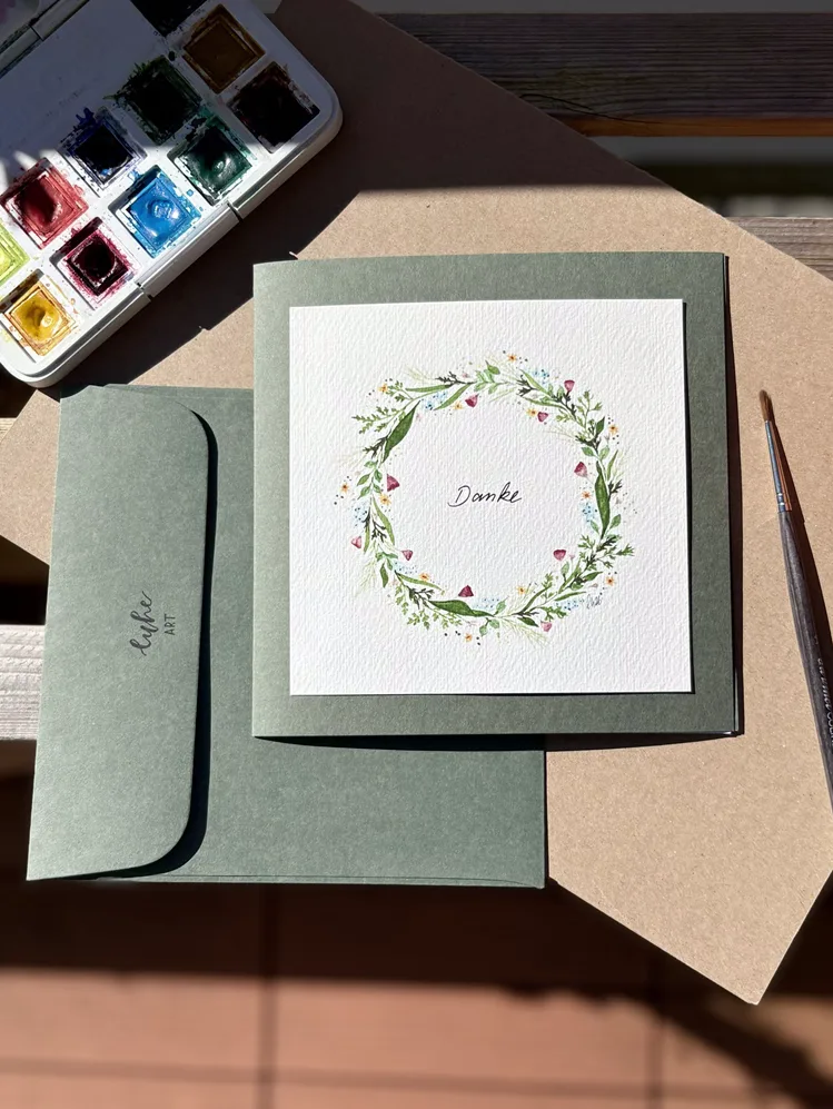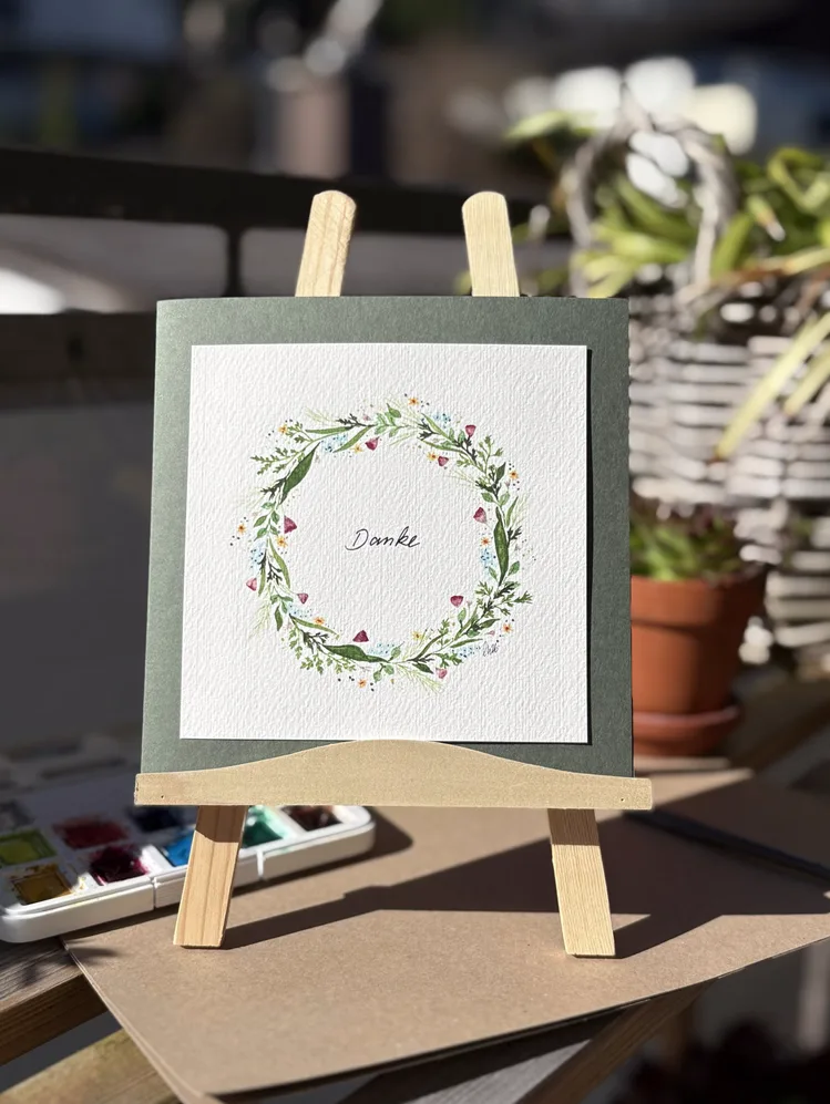Der Blumenkranz sowie der Schriftzug „Danke“ wurden von mir von Hand mit Aquarellfarben gemalt und mit Fineliner geschrieben, anschliessend sorgfältig digitalisiert und in einer limitierten Kleinstauflage auf hochwertigem Papier gedruckt.